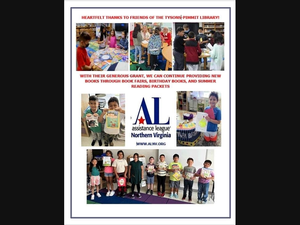 Assistance League of Northern Virginia is extremely grateful to Friends of the Tysons-Pimmit Regional Library and Janelle Blanchard, president of the group, for awarding the nonprofit a very generous grant in recognition of its Literacy for Kids program. Through that program, Assistance League provides reading-tutoring assistance to young students at several Title 1 schools and donates brand new books to students through book fairs, books for birthdays and summer reading, and schools’ Little Libraries.