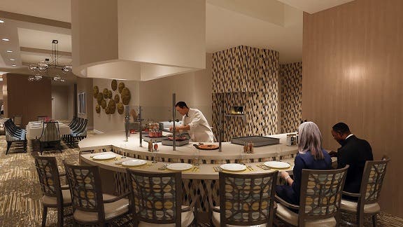 The formal Delano’s restaurant is reminiscent of a high-end steakhouse showcasing fresh, farm-to-table cuisine. Delano’s features a demonstration kitchen with an open-hearth oven.