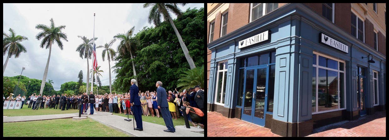 PHOTOS: U.S. Secretary of State John Kerry and Chargé d’affaires DeLaurentis watch as Marines raise the American flag at the Ambassador’s residence in Havana, Cuba, Friday, August 14, 2015. [State Department photo/ Public Domain]; Bastille restaurant in Alexandria, photo courtesy of restaurant via Facebook