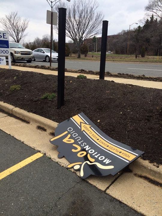 Alexandria, VA March 30, 2015----Local Motion Studio in Alexandria, VA has a unique way of dealing with the vandals who tore down their business sign over the weekend. The company is offering the defacer a year’s worth of free yoga.