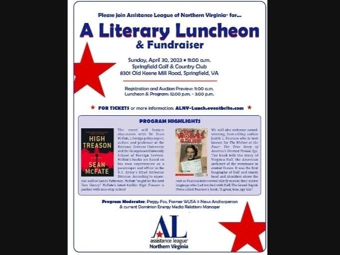 On Sunday, April 30, Assistance League is hosting A LITERARY LUNCHEON & FUNDRAISER, at which two award-winning authors – Sean McFate and Judith Pearson -- will discuss their books. Peggy Fox will be the moderator.