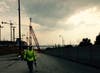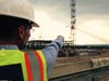 A security gatehouse stops all vehicles and guests must sign in and out. The site is humming, as construction continues around the clock with about 1,000 workers coming and going in hard hats and neon vests. A food truck is parked on site where workers stop by for a bite to eat.
