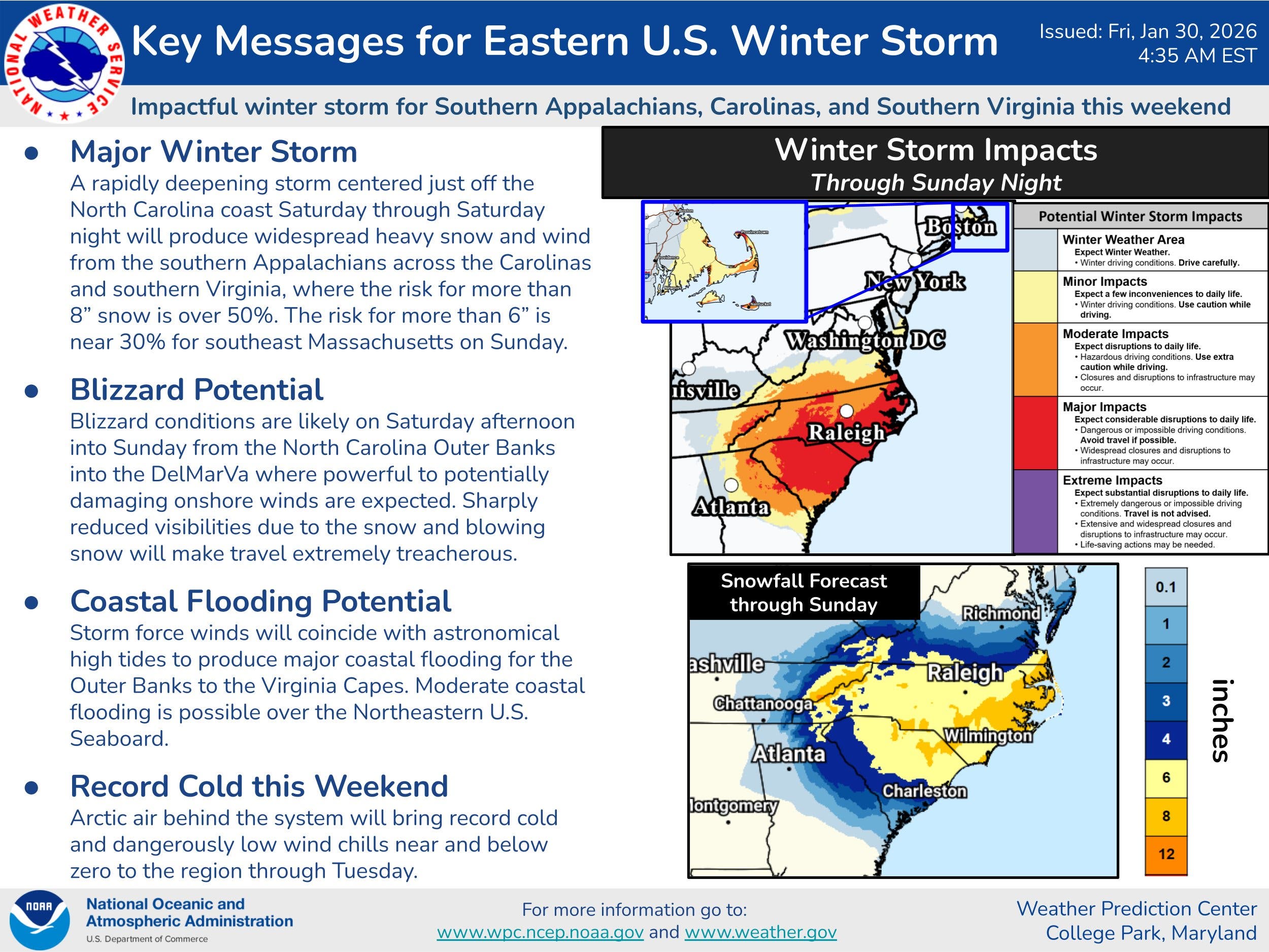 The most significant snowfall is predicted for the Carolinas, the southern Appalachians and parts of southern Virginia, where a winter storm warning is in effect from 4 a.m. Saturday until 7 p.m. Sunday. Total snow accumulations between 5 and 10 inches are expected.