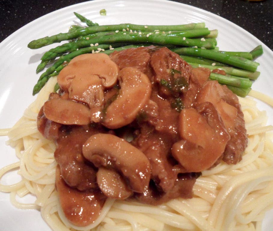 Add broth, and wine. Mix in mushrooms, shallots or green onion, and Worcestershire sauce. Bring skillet ingredients to a boil. Reduce heat and simmer, uncovered, for 10-15 minutes or unto sauce thickens. Serve over linguine or over favorite pasta with favorite vegetables. I served this dish with asparagus with drizzled Sesame Olive Oil with toasted sesames.