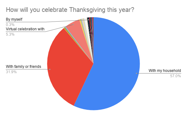 Among the respondents, 57 percent said they're only celebrating Thanksgiving with their households. Another 31.9 percent plan to celebrate with family or friends who are outside their households, and 5.3 percent plan to celebrate virtually. The remainder said "other," with responses ranging from people celebrating both with their households and virtually to those celebrating alone.