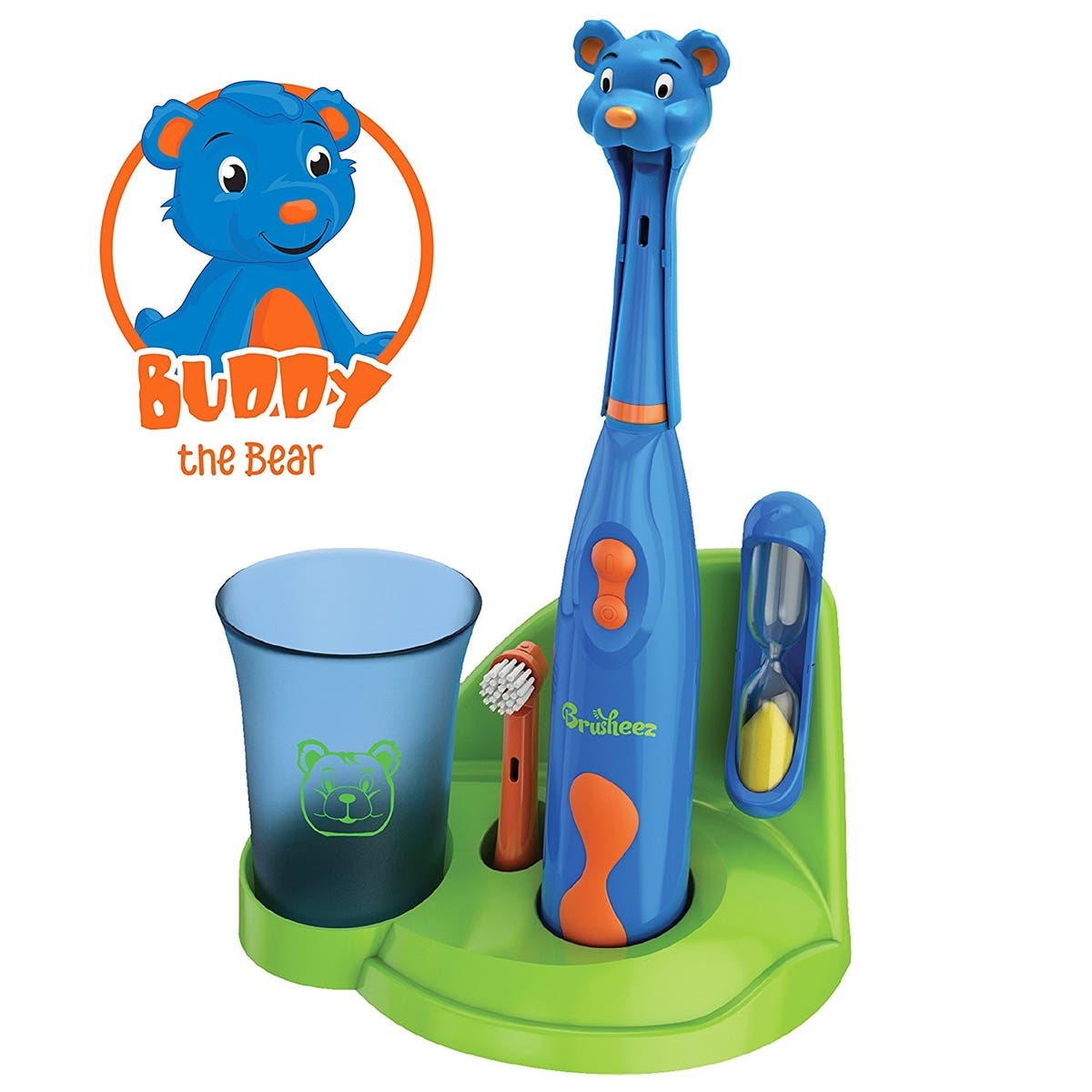 Kids will actually look forward to brushing their teeth each morning and night with this adorable Buddy the Bear electronic toothbrush set. It includes a battery-powered toothbrush, two brush heads, an animal head brush cover, a 2-minute sand timer, a cup for rinsing and a storage base.