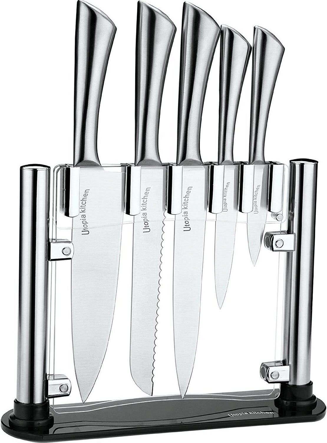 This quality set includes a chef knife, bread knife, carving knife, utility knife and a paring knife that all fit beautifully in the sleek acrylic stand.