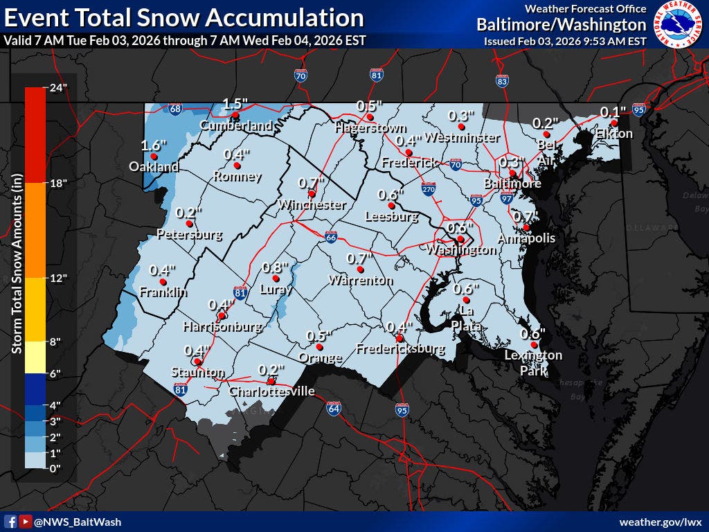 While snowfall totals are expected to be lower than recent storms, cities like Washington, D.C. and Baltimore could see up to an inch late Tuesday night into Wednesday morning, AccuWeather forecasters said.