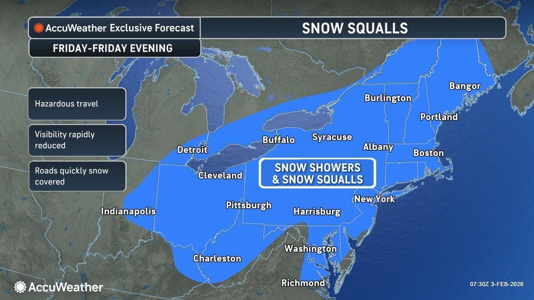 Forecasters said snow showers and snow squalls could develop along and ahead of the front, including during the Friday morning and evening commutes.