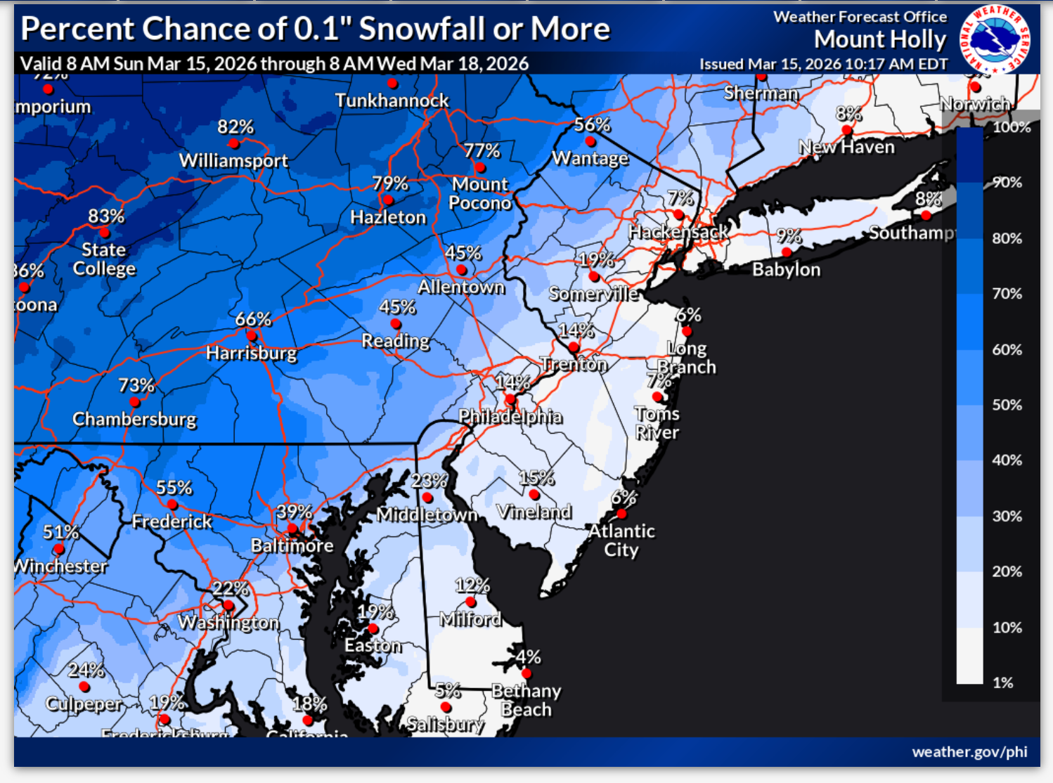 The cold front may lead to snowfall on Monday night as temperatures drop into the upper 20 and low 30s. There's an 80 percent chance of snow in Maryland, but it should only amount to a half inch or less, the NWS says.