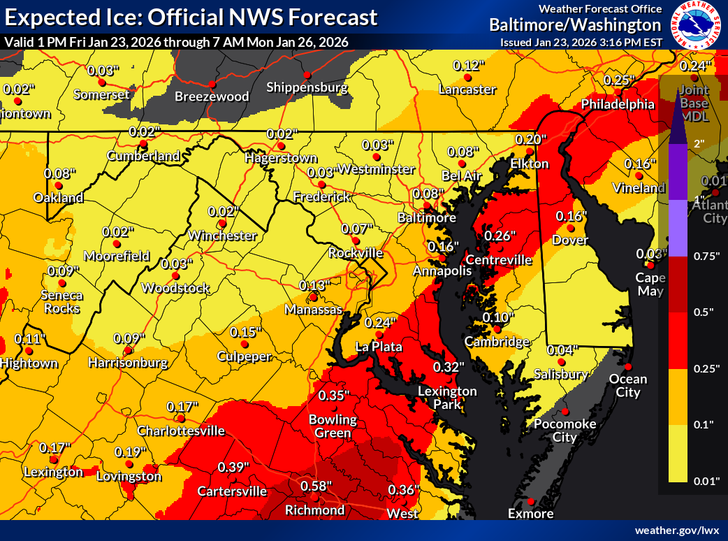 "The weight of freezing rain can snap tree limbs and power lines, leading to power outages," the Capital Weather Gang wrote. "Most projections for the Beltway area suggest 0.1 to 0.3 inches, but some areas could see more — particularly from around Fredericksburg into Southern Maryland, where the risk of disruptive amounts of ice is growing."