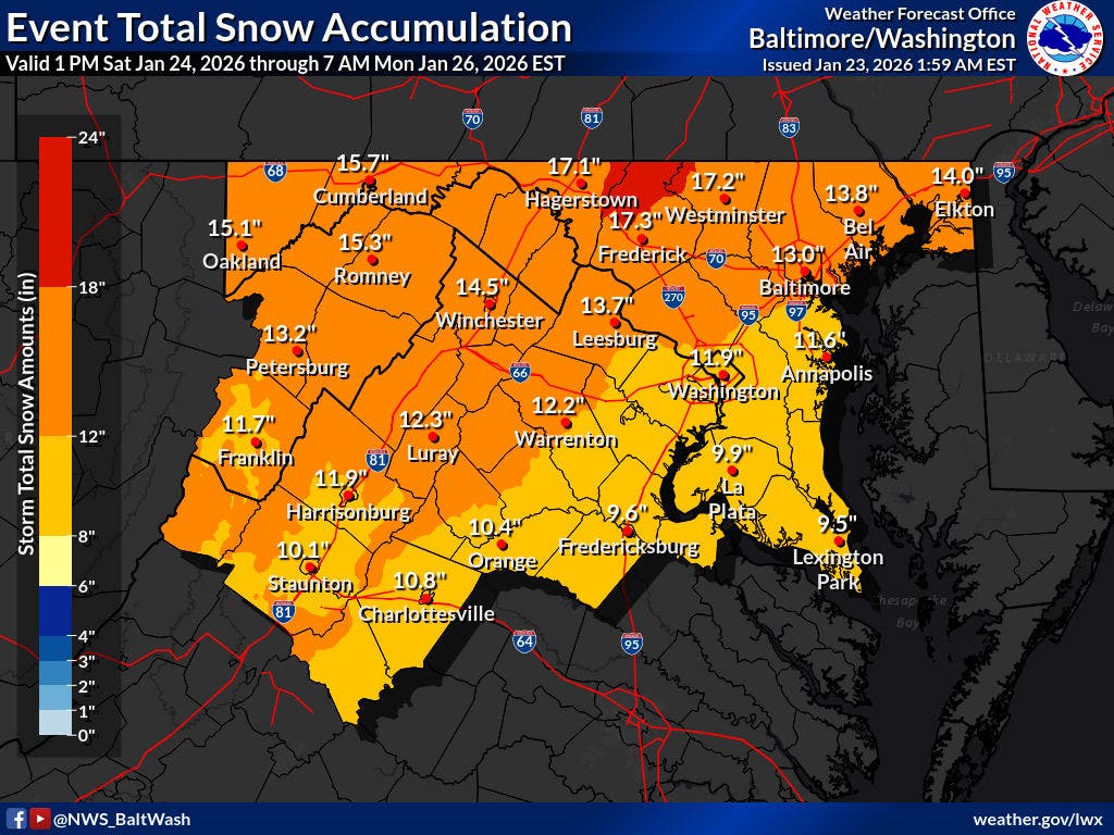 The storm will drop 6 to 10+ inches of snow near the Beltway, with higher totals possible north and west of Dulles International Airport, in areas including Frederick, Maryland and Leesburg. NBC said 10 to 14 inches of snow is possible in those areas.