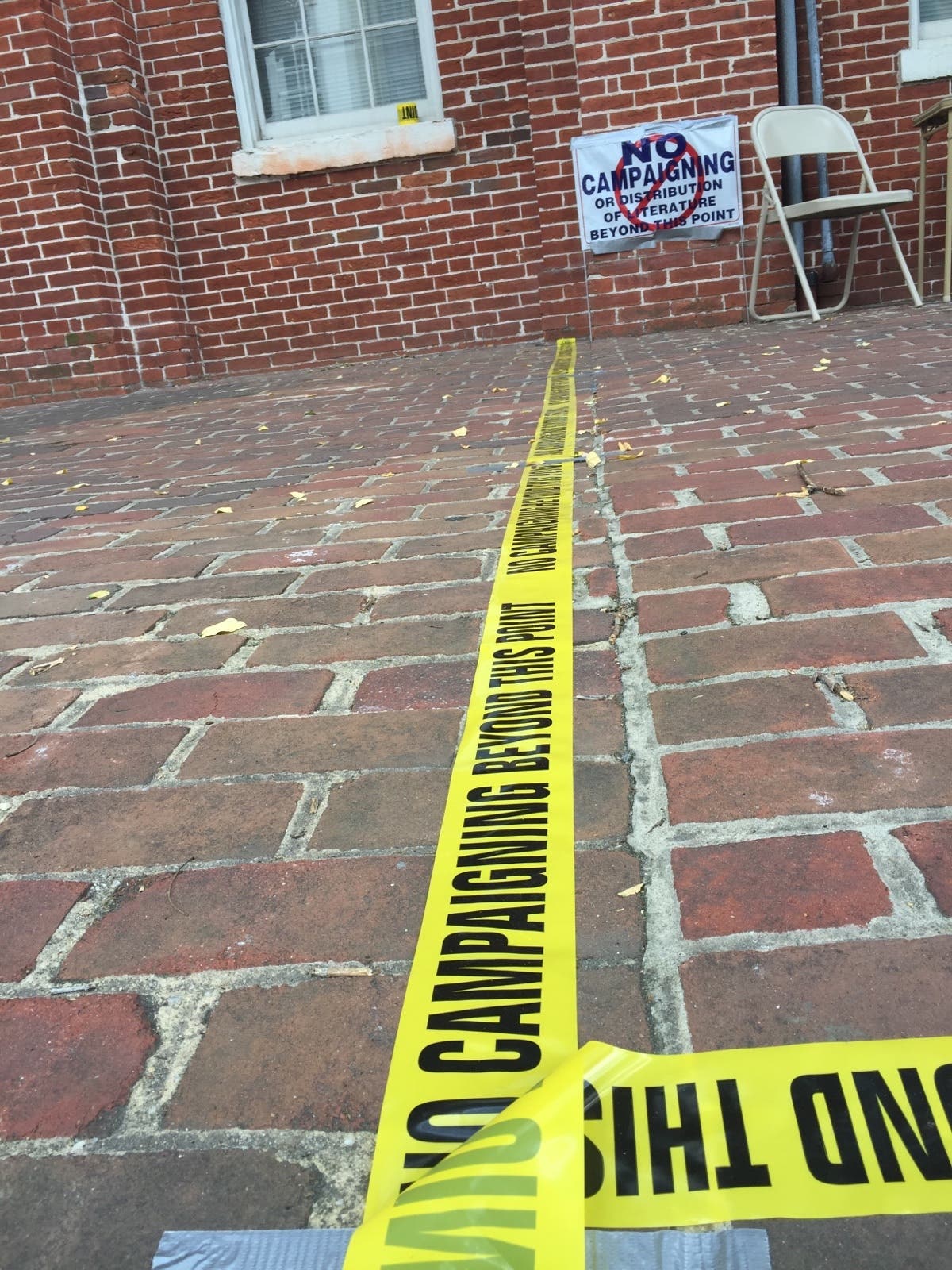 3:45 p.m. - Voting precincts usually hang posters in polling places stating that campaigners must stay 40 feet away from the building entrance. The City of Alexandria took it a step further to specify this rule, layout out yellow do-not-cross tape.