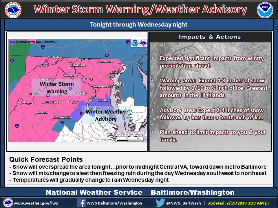 In addition to DC and Virginia, much of Maryland and the eastern panhandle of West Virginia are under the winter storm warning through Wednesday night.