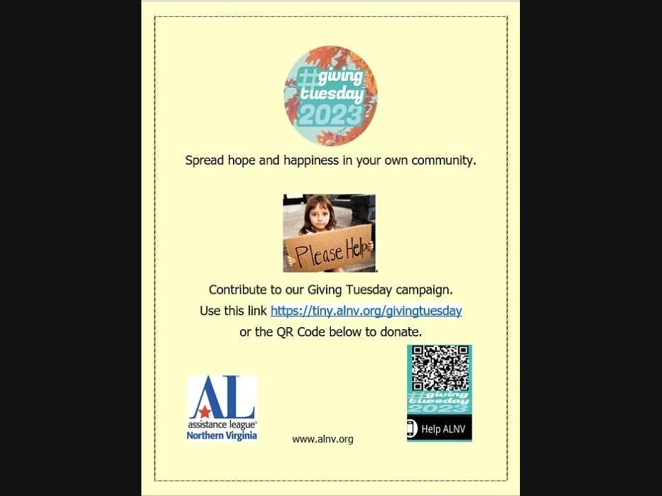 Giving Tuesday is a wonderful way to support Assistance League programs that provide weekend food bags and grocery gift cards, clothing, toiletries, books and literacy support to more than 5000 students annually in Northern Virginia. Please support those efforts with a generous contribution. We’ve received donations to match the $1,000 grant and are on our way with our second donor match of $1,500. We don’t want to waste that opportunity or fail to reach our goal of raising $8,000.