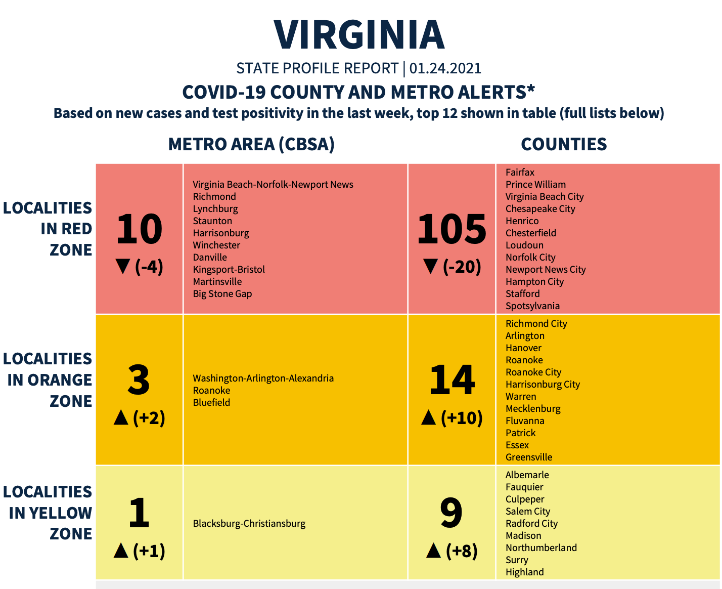 Ten Virginia metro areas were in the "red zone" this week, and 105 counties.