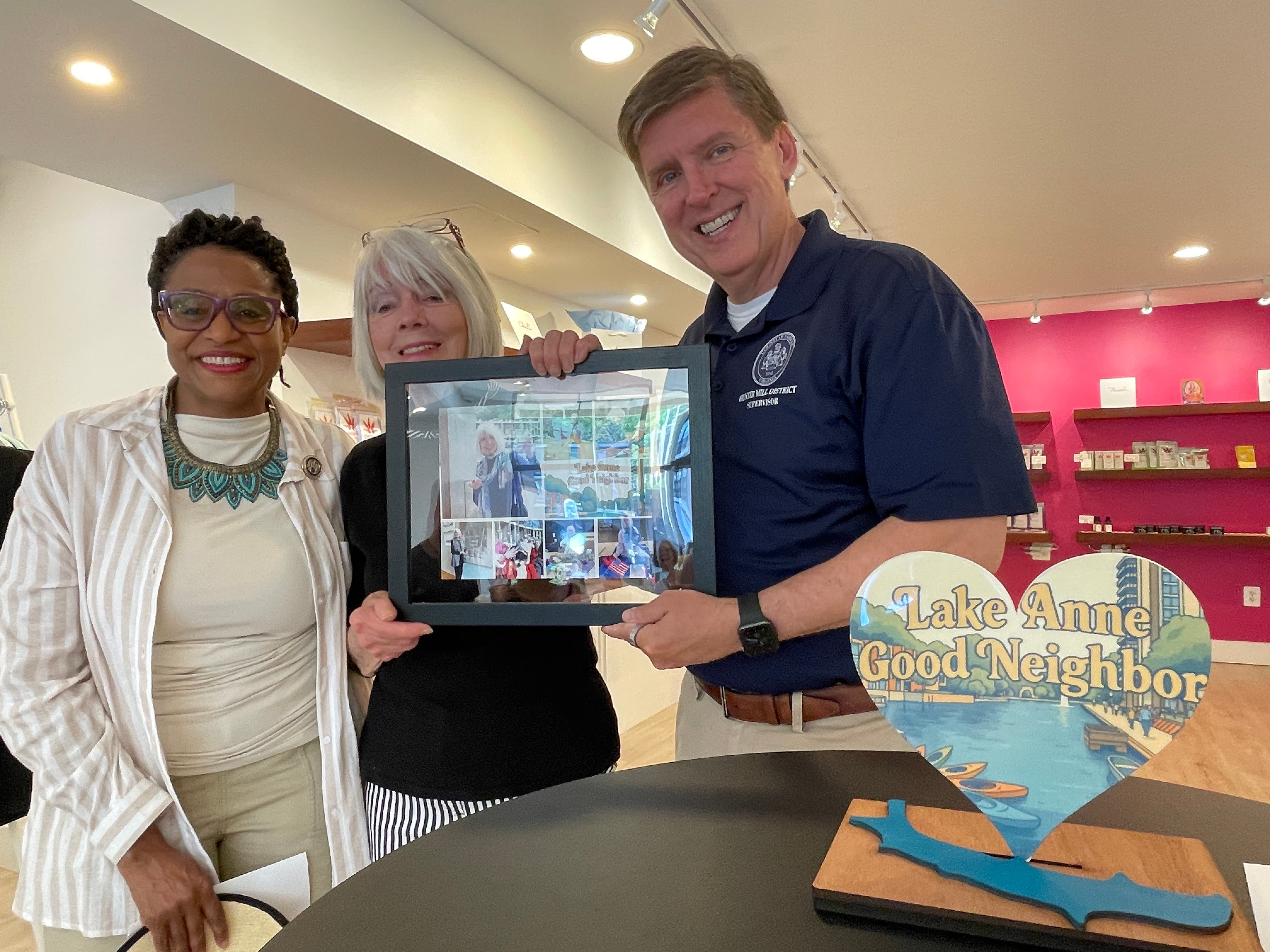 Pat McIntyre (center) was recognized with a 2026 Good Neighbor Award for hosting a crafts table on Saturdays at Lake Anne where children can gather and make seasonal projects. (Radhika Murari)