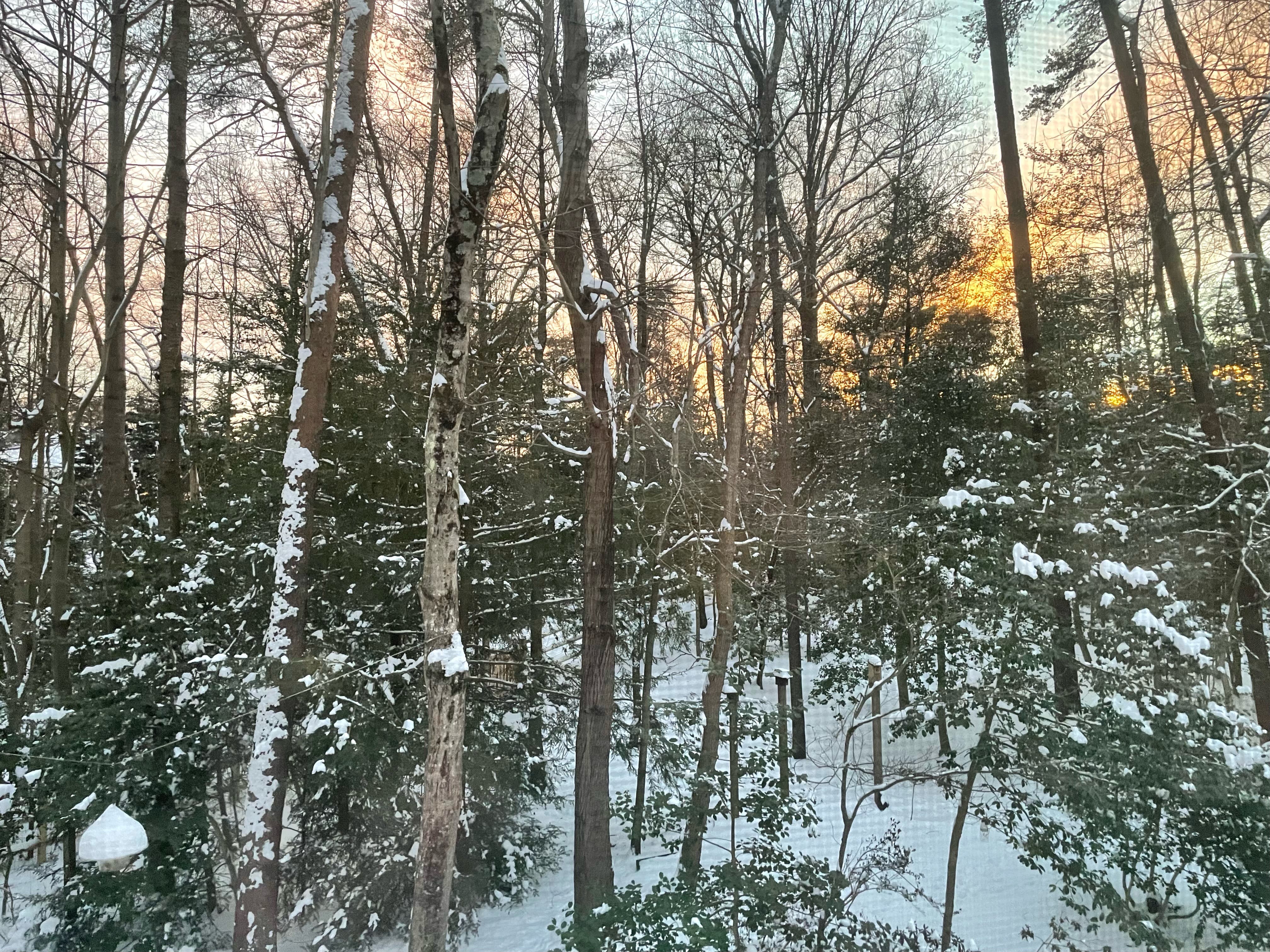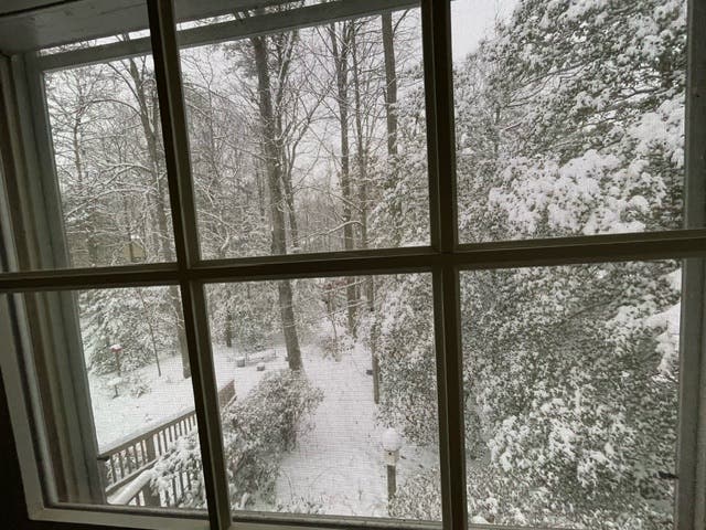 You really have to look very closely, but it is when the snow first started. Then, surprisingly and joyfully, 3-3.5 inches of powdery bliss was on the ground and looked so picturesque on the tree limbs.