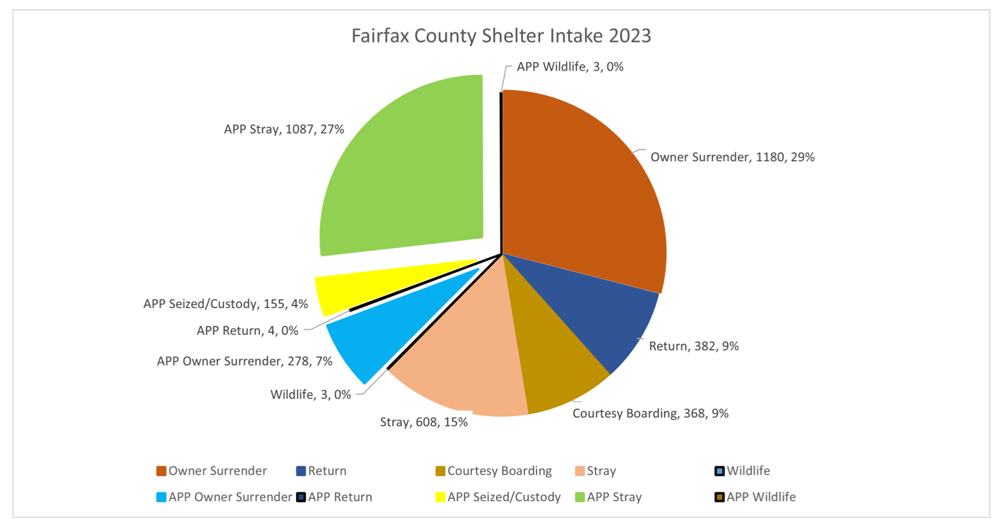 During 2023, the Fairfax County Animal Shelter touched the lives of more than 6,400 pets, saving 3,857 lives through adoption and unification, as well as placing 1,166 pets in foster homes and distributing 25,016 pounds of pet food to the community. In addition, a second shelter in Lorton was opened to provide animal support services to South County residents.