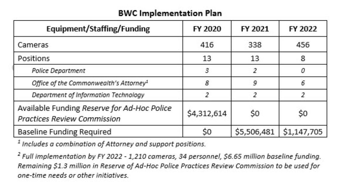 Originally, the plan was to issue cameras to personnel at the Sully, McLean, and West Springfield stations in 2021, and at the Fair Oaks, Franconia, and South County stations in 2022. Now, it's uncertain when the funding for those phases will be allocated.