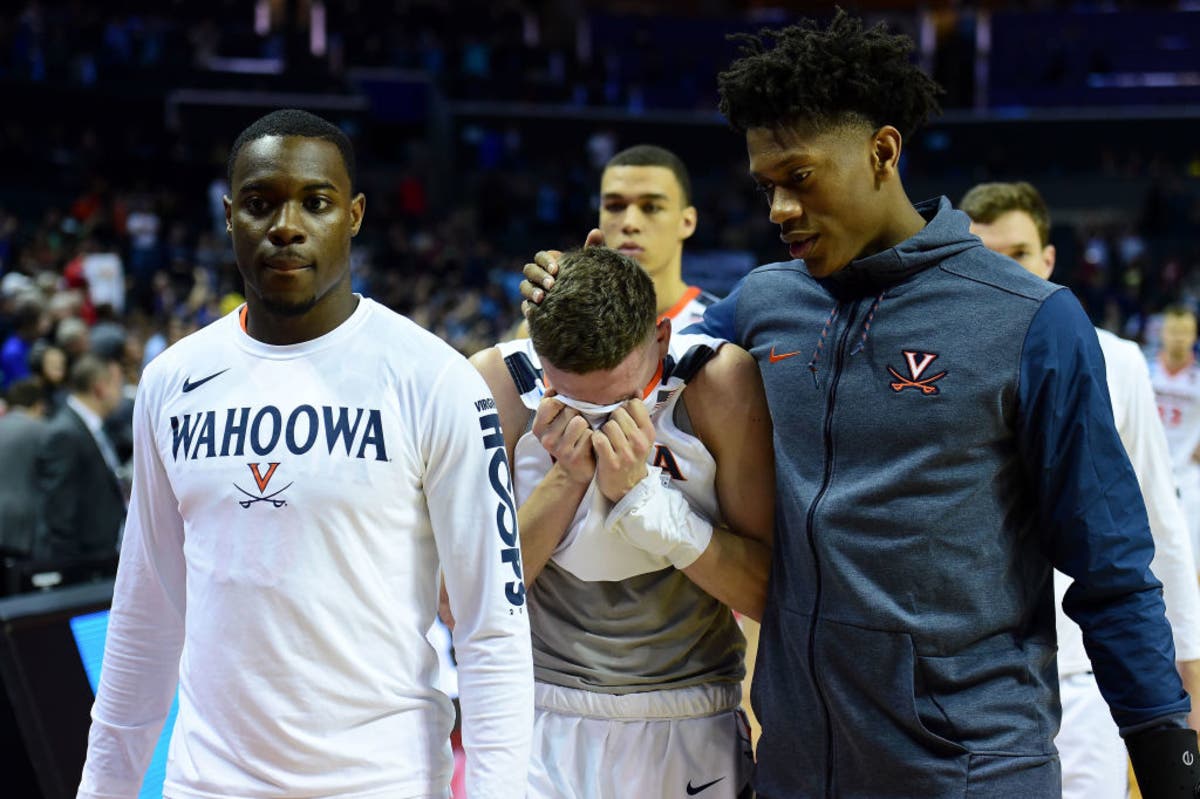 PHOTO: Kyle Guy of the Virginia Cavaliers exits the court after their 74-54 loss to the UMBC Retrievers during the first round of the 2018 NCAA Men's Basketball Tournament at Spectrum Center on March 16, 2018 in Charlotte, North Carolina. (Photo by Jared C. Tilton/Getty Images)