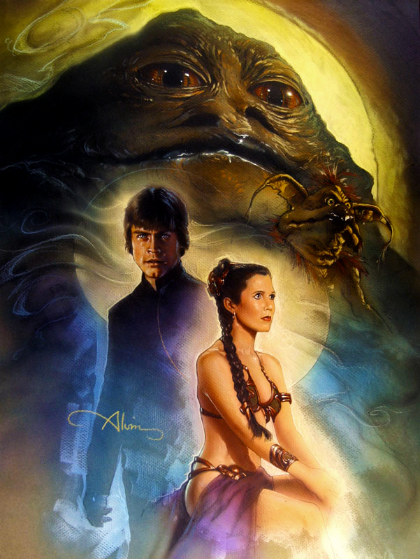 IMAGE: “There Will Be No Bargain” features Princess Leia, Luke Skywalker, Jabba the Hutt and Salacious Crumb in a limited edition glicee on canvas by John Alvin.