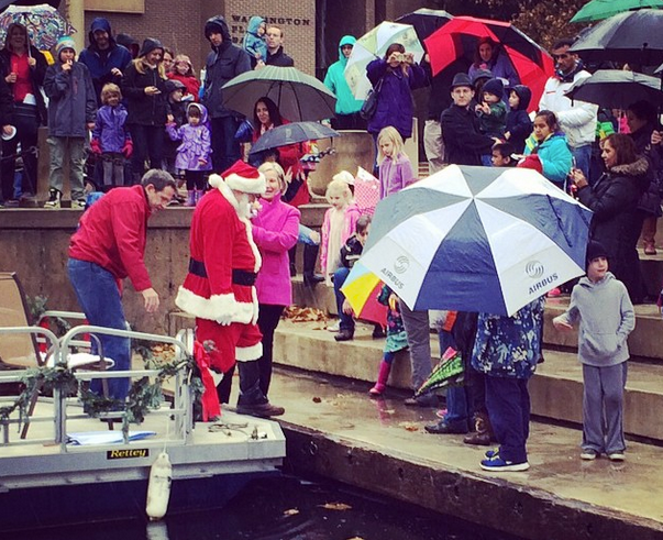 PHOTO of Santa arriving Saturday at Lake Anne Plaza courtesy of Fun in Fairfax via Instagram.