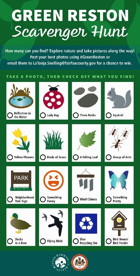 Those wishing to take do the scavenger hunt before April 24 can do so by snapping photos of the things that make Reston an environmentally vibrant community. Check out the Green Reston Scavenger Hunt checklist below. Be sure to use the #GreenReston hashtag when you share your photos on social media. Those who don't use social media can email their photos to: Latanja.Snelling@fairfaxcounty.gov. Visit the Customer Service Desk at RCC locations or click this link for a list of nature-themed items to find near where you live.