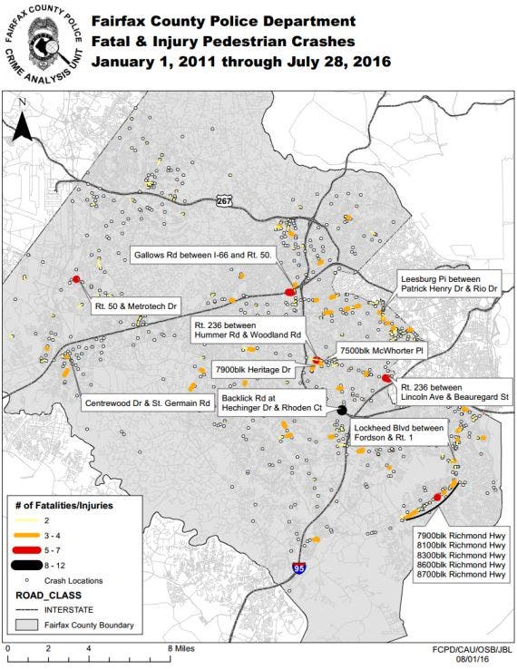 Fairfax County Police announced a "Street Smart Traffic Safety Initiative" aimed at reducing pedestrian injuries and fatalities, and released a map showing where crashes involving injury to a pedestrian have happened in the county between Jan. 1, 2011 and July 28, 2016. The Traffic Division Crime Analyst identified 11 areas where there has been a higher incidents of pedestrian fatal or serious injury crashes over that period, and none of them are anywhere near the Reston or Herndon areas.