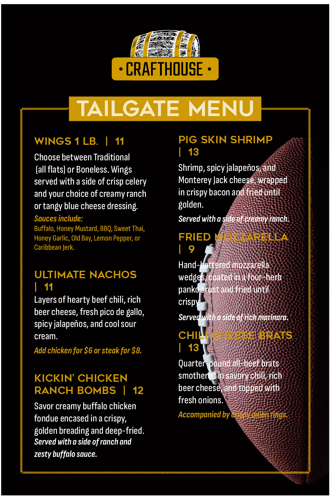 Crafthouse, which is located a 1888 Explorer St. in Reston, will offer a Tailgate menu (see below) of wings, nachos, chili cheese beef brats and fried mozzarella during the radio shows.
