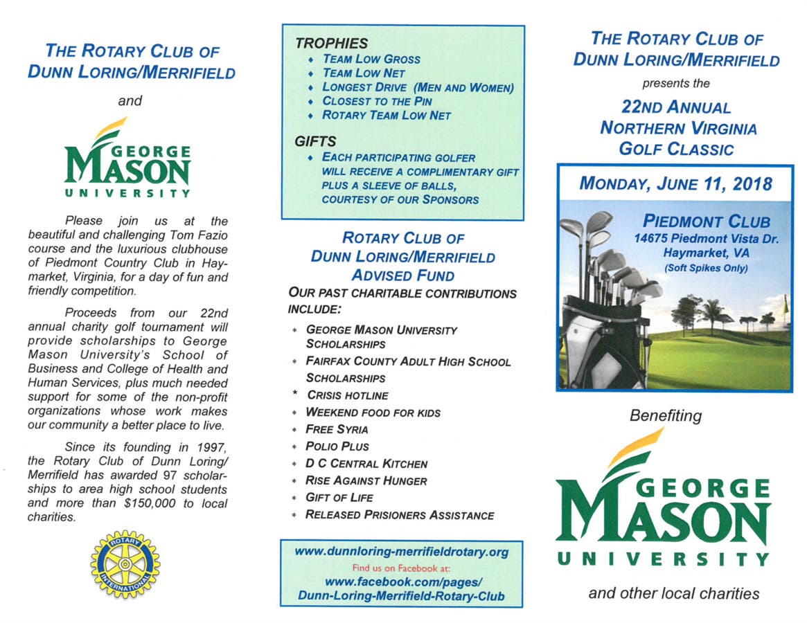 The Dunn Loring- Merrifield Rotary Club is holding its 22st Annual Northern Virginia Golf Classic at Piedmont Club in Haymarket, VA on Monday, June 11, 2018. Proceeds will provide scholarships to GMU students and support some of the nonprofit organizations whose work makes the community a better place to live, including Assistance League of Northern Virginina. To learn more, visit www.dunnloring-merrifieldrotar... or contact Ed Hogg: ehogg9@gmail.c0m.