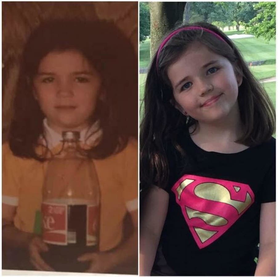 This is a split screen shot of me when I was eight years old in 1982 in Fairfax Virginia alongside my daughter Ryan at age 8 years old Last year! I had never seen this picture until six months ago when an old friend reconnected on Facebook and sent me it after her mom found it in the shoe box of pictures and her attic! The resemblance was so uncanny that even I couldn’t believe it! I love the concept of this and hope that mine shows how strong genetics can be… For real!