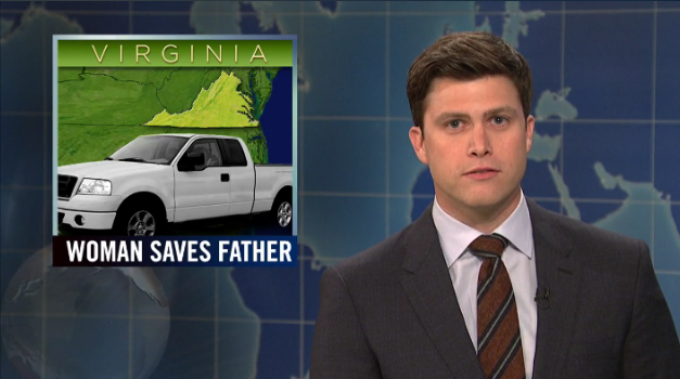 “A teenage girl in Virginia saved her father after he was trapped under a burning pickup truck and she lifted it off him,” said SNL’s Colin Jost.