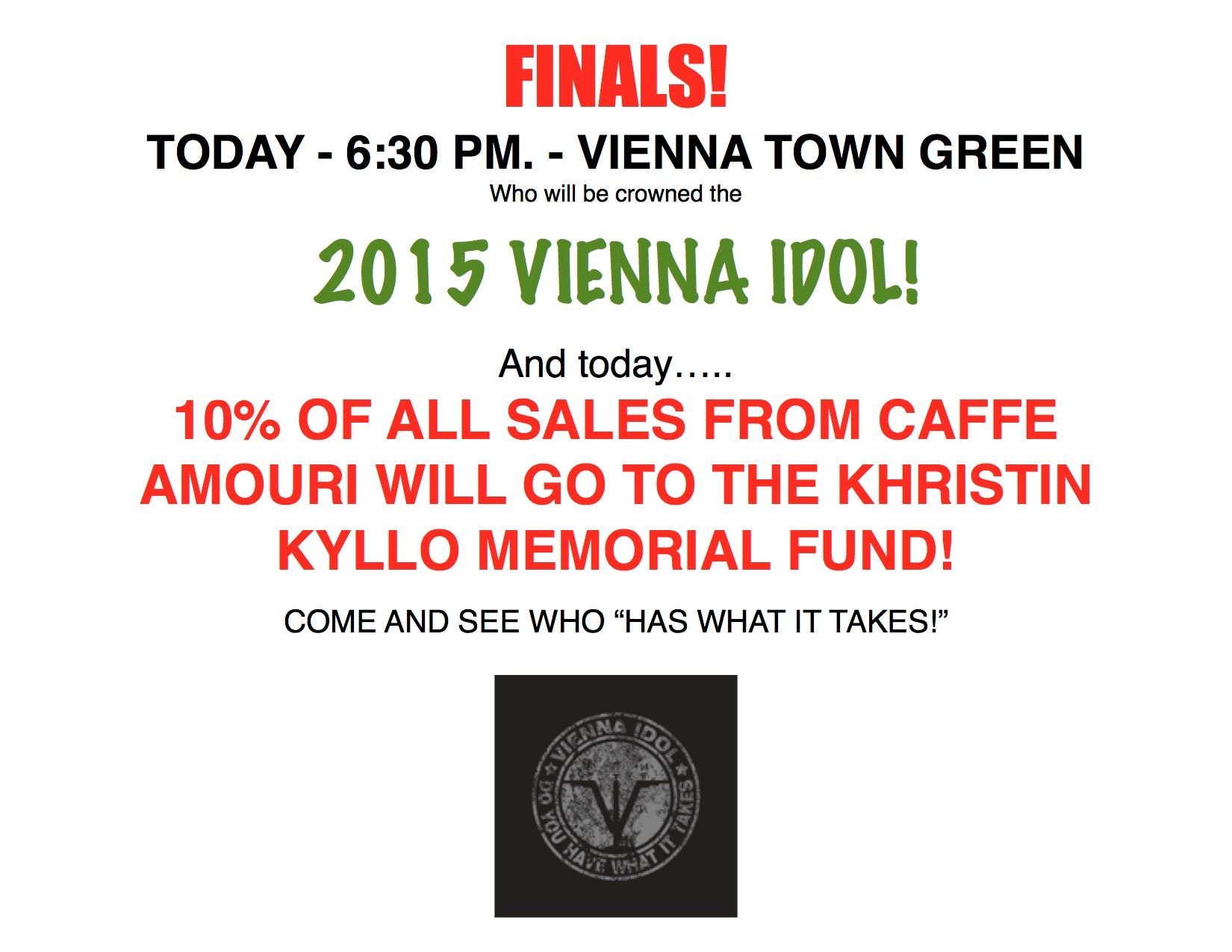 VIENNA IDOL FINALS - Caffe Amouri to donate 10% of Sales to the KHRISTIN KYLLO MEMORIAL FUND