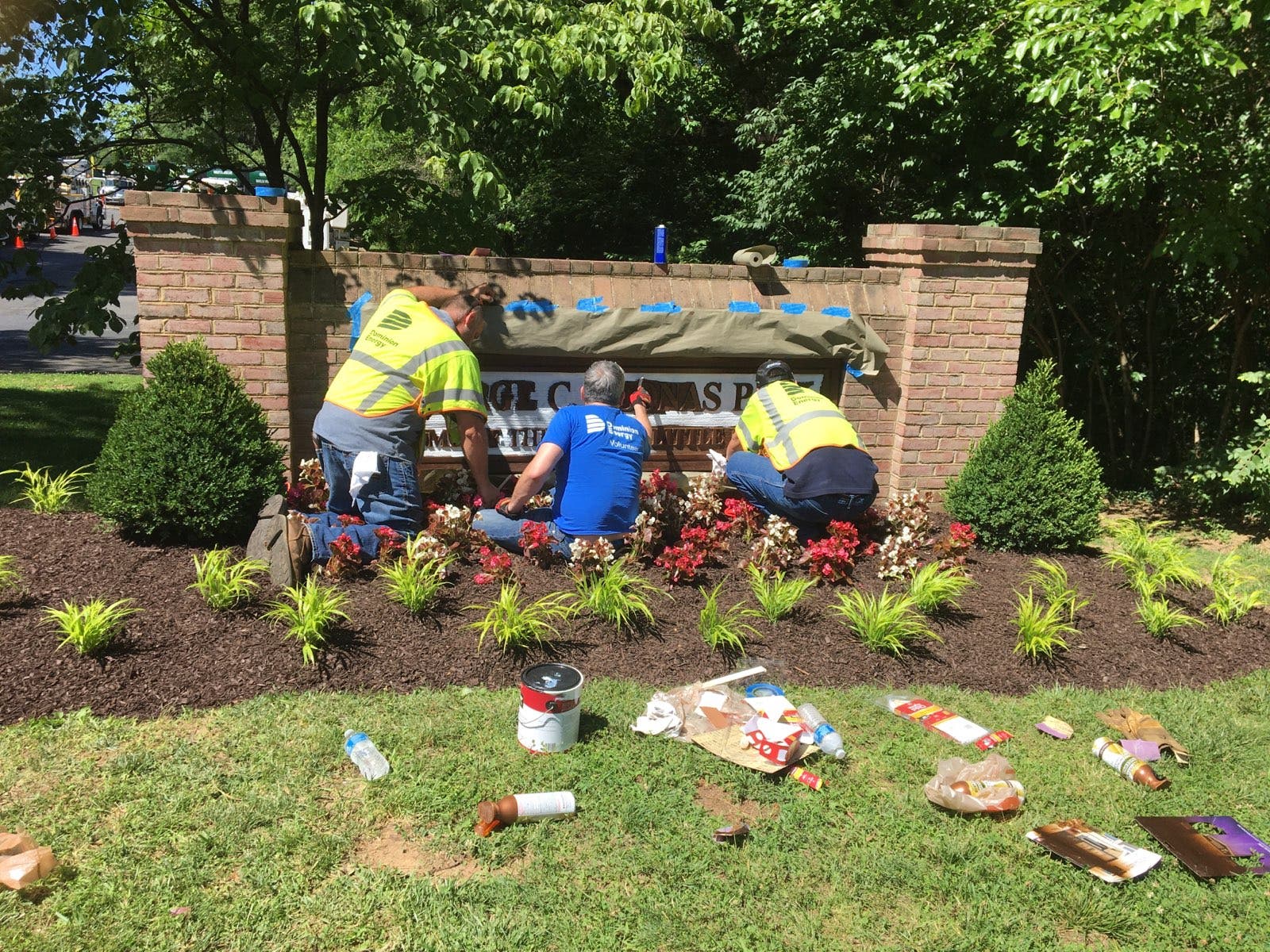 On Thursday, the Dominion Energy volunteers worked on painting the entrance sign and other areas, stripping and re-coating the floor of the clubhouse, installing gates on dugout entrances, installing a new door on the Crabtree Field Press Box, adding solar lights on three flag poles, adding lights to the entrance sign, and spreading mulch.