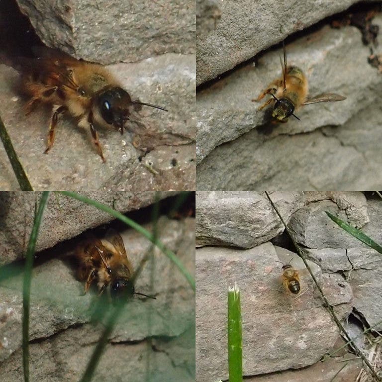 At last, after a few days, I finally found some mason bees! Not the blue Osmia lignaria that I released, but a different kind, a non native (but beneficial) mason bee: Osmia taurus.