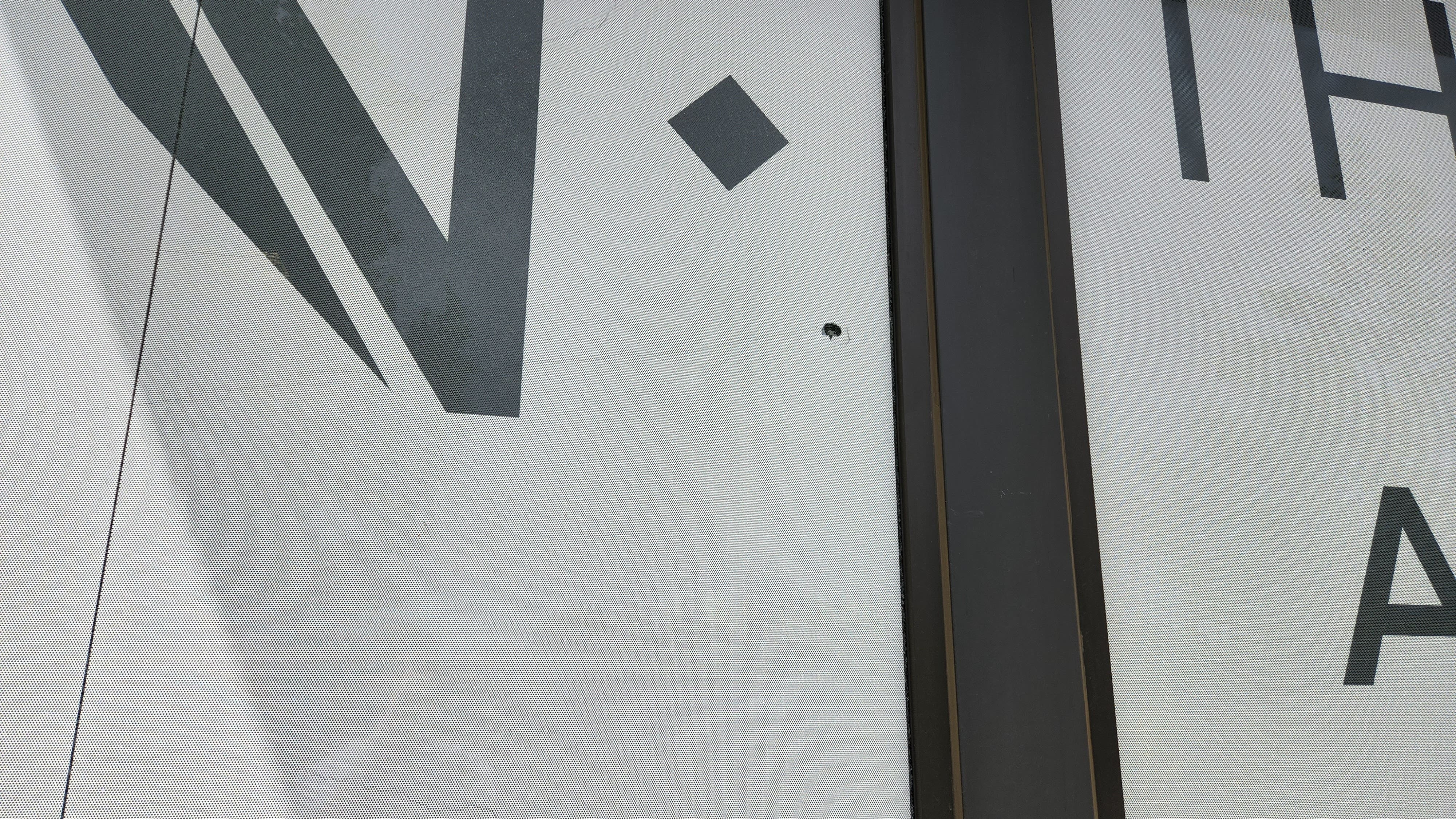 A window at the apartment complex's leasing office was damaged in the shooting.
