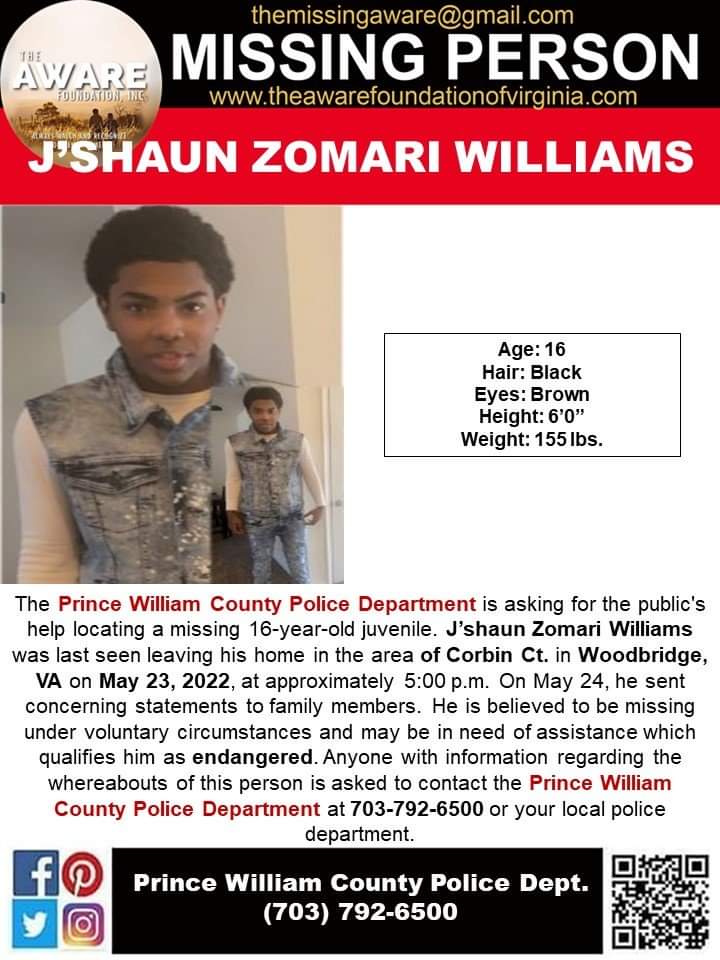 Police are looking for 16-year-old J'shaun Zomari Williams, who was last seen leaving his home in Woodbridge around 5 p.m., on Monday.