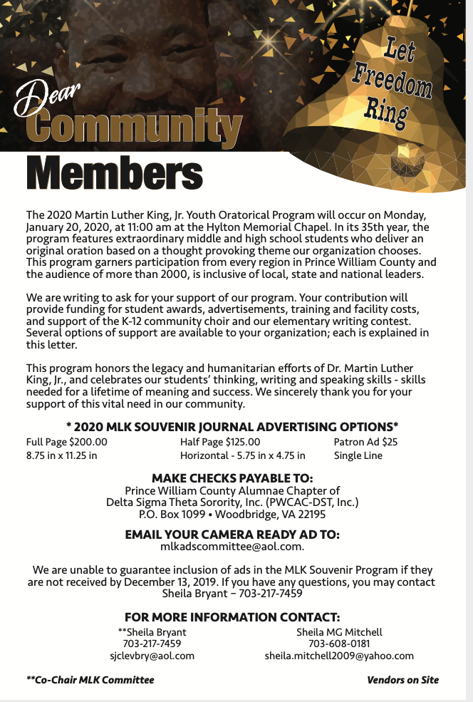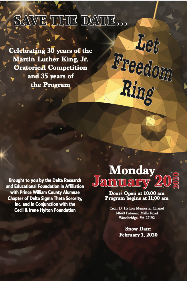 January 20, 2020 will mark the annual celebration of the Reverend Dr. Martin Luther King, Jr. Holiday across the nation and the 30th anniversary of the Martin Luther King Youth Oratorical Contest and Program hosted by the Prince William County Alumnae Chapter of Delta Sigma Theta Sorority, Inc. (PWCAC-DST, Inc.) in affiliation with the Delta Research and Educational Foundation (DREF) at the Hylton Memorial Chapel in Woodbridge, Virginia. The PWCAC-DST, Inc. has celebrated this historic day since its beginning. The theme for the 2020 program is “Let Freedom Ring” which was the theme for the first oratorical contest.