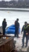 Photo: A rescue crew with an inflatable boat prepares to go out on Lake Montclair on Tuesday to pull a dog (in background) off the ice and bring him back to shore. Credit: Prince William County Fire & Rescue Department
