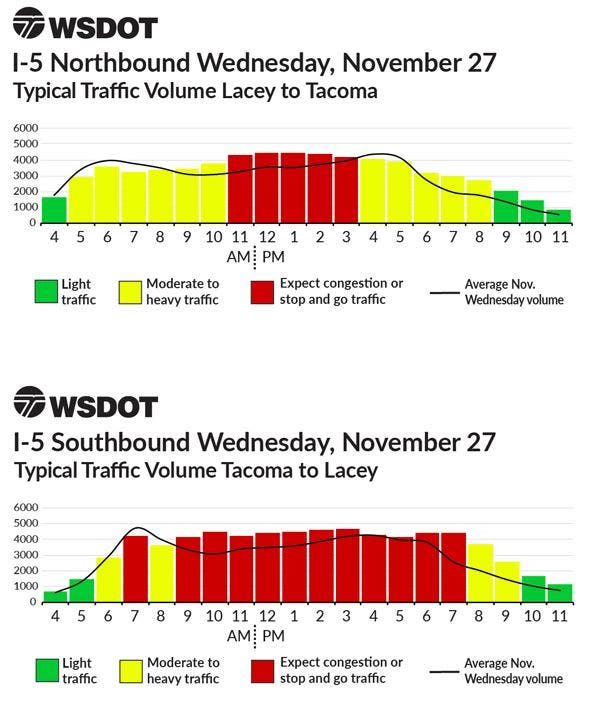 In Pierce County, WSDOT projects heavy northbound congestion on Interstate 5, between Lacey and Tacoma, from 11 a.m. to 4 p.m Wednesday. Southbound travel will be even slower, with congestion expected from 7 a.m. to 8 p.m. WSDOT said travelers will have an easier shot on Thanksgiving Day, apart from some southbound delays early on.
