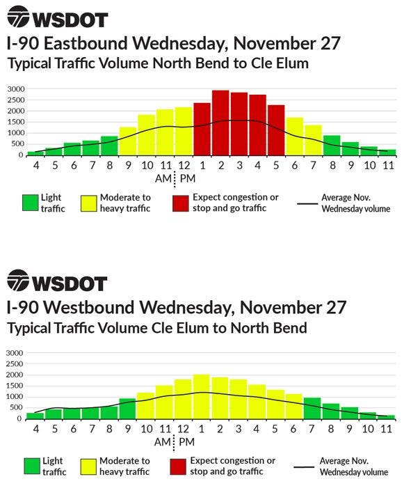 On Interstate 90, over Snoqualmie Pass, the toughest days for eastbound travel will be Wednesday and Sunday, Dec. 1. Westbound congestion will peak Saturday and Sunday afternoon. A slight chance of snow is in the forecast over the mountains Wednesday, but conditions should clear late in the day and stay sunny through the weekend.