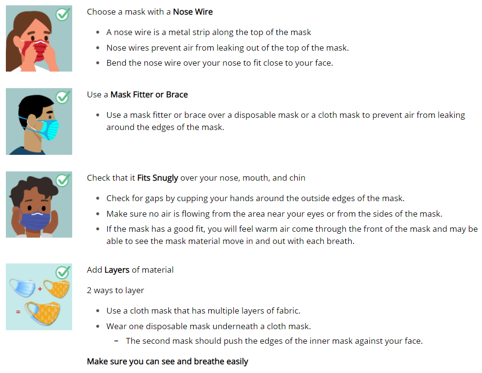 Cloth masks with at least two layers, especially made from material with higher thread counts, have proven to be more effective than just one layer, officials said. Another thing to remember in the winter months is to change out makes when they become wet and pack a spare if you are venturing out into the elements.