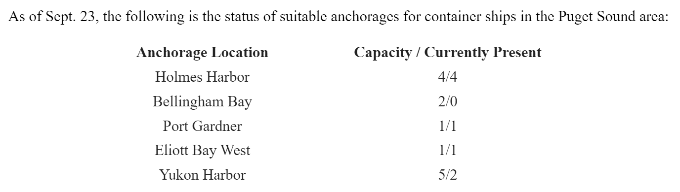 SEATTLE — Puget Sound is contending with more container ships than it has anchorages for as the West Coast navigates an unprecedented backlog in large vessels. According to the U.S. Coast Guard, suitable anchorage areas are at or above capacity across the region due to supply chain issues and logistics challenges affecting both the United States and Canada.