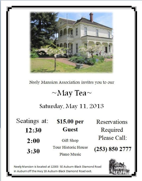 Celebrate Spring at an authentic Victorian Tea at historic Neely Mansion.  Tour the Victorian Classic Revival farmhouse and grounds, and explore the gift shop.   The cost is $15 per person; proceeds go toward the continuing restoration of this National Landmark, built by one of King County’s earliest and most influential pioneer families.  Â