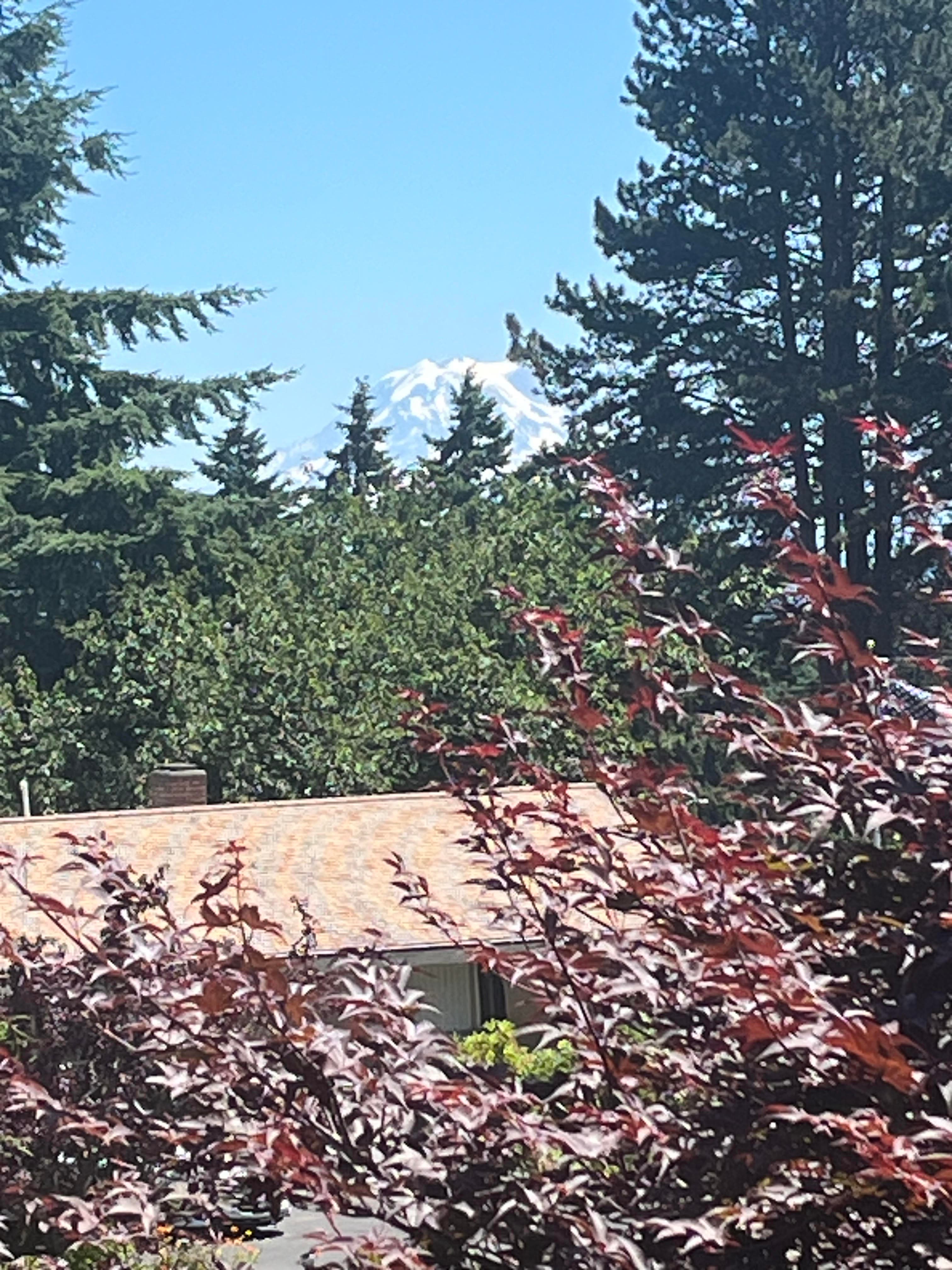 Sitting on the porch outside my rental, I soak in the tranquility of the area as a gentle breeze moves across a cloudless sky. Evergreen trees dominate the landscape, and in the distance, Mount Rainier stands tall, its peaks covered by snow. While it is often hidden behind clouds, today its presence is unwavering.