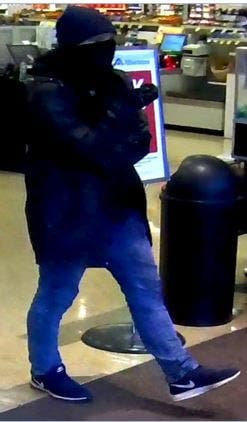 Officers say they believe the same suspect robbed cash registers at two Gig Harbor-area grocery stores, and is wanted for similar robberies in North Bend and Renton. The suspect's outfit differs for each robbery, but police say in each case he has worn the same pants and shoes.