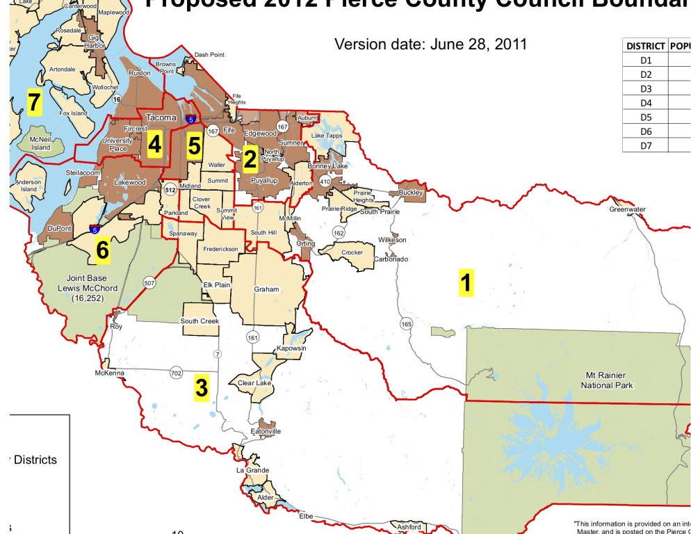Also, Joint Base Lewis-McChord would be part of District 6, which includes pockets of Lakewood, Tacoma and unincorporated Pierce County.