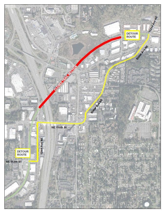 KIRKLAND, WA - The Cross Kirkland Corridor will be closed to pedestrians and bicyclists through Thursday this week as crews conduct preliminary work in preparation for the Totem Lake connector bridge. There's a detour in place, which routes users across Northeast 116th Street and up Slater Avenue Northeast.
