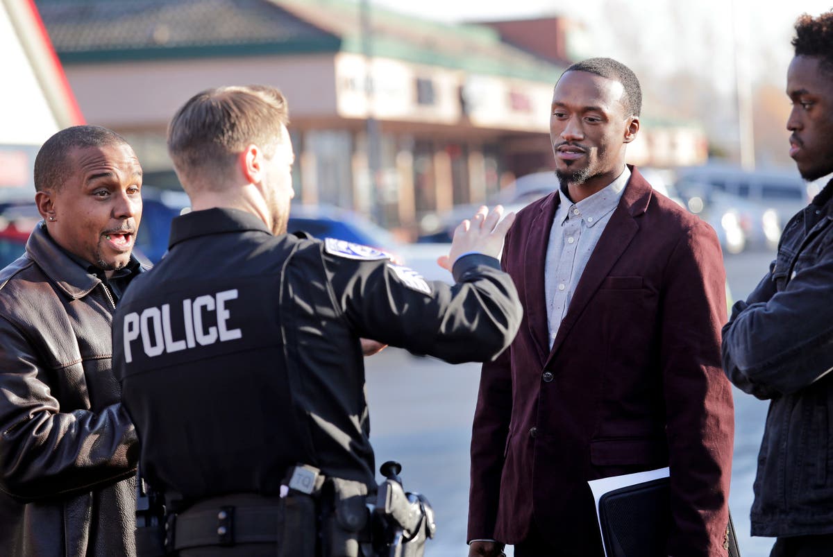 Caption: Byron Ragland, second right, talks with Kirkland police Sgt. Eric Karp as Gerald Hankerson, left, president of the Seattle King County NAACP, looks on near a frozen-yogurt shop that Ragland was kicked out of. The police department there has apologized for an incident in which officers helped the owner of the Menchie's shop expel Ragland, an African-American man, from the business because employees said they felt uncomfortable. The Seattle Times reported that the shop's owner called police on Nov. 7 about Ragland, who works as a court-appointed special advocate, who was in the shop supervising a court-sanctioned outing between a mother and her son.
